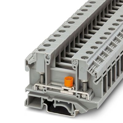Blok końcowy odłączający, z przekrętem odłączającym i śrubami w gniazdku badawczym do wstawiania wtyczek badawczych, napięcie nominalne: 1000 V, prąd nominalny: 36 A, metoda podłączenia: połączenie śruby,Nominalny przekrój: 6 mm2, mocowanie: NS 35/7,5, NS 35/15, NS 32, kolor: szary