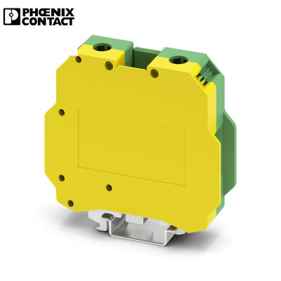 Protective conductor terminal block, number of connections: 2, number of positions: 1, connection method: Screw connection, Rated cross section: 50 mm2, cross section: 16 mm2 - 50 mm2, mounting method: PE foot with mounting screw, M6, mounting type: NS 35/7,5, NS 35/15, NS 32, color: green-yellow